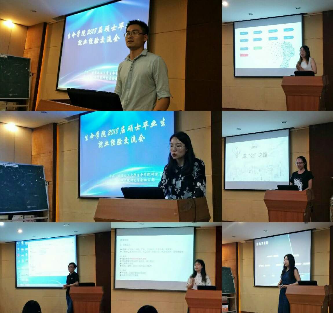为加强各年级同学与优秀毕业生之间的交流与沟通,帮助同学们把握更多的就业信息,2018年6月22日晚6点,由生命学院研究生会主办的2018届硕士毕业生就业经验交流会在科技大厦顺利举行。出席交流会的师兄师姐有解永超、郝丹丹、李陈孟、袁雪铭、王如意、田小军和黄凌月(名字按出场顺序排列),本次交流会吸引了众多学生,现场气氛热烈。
